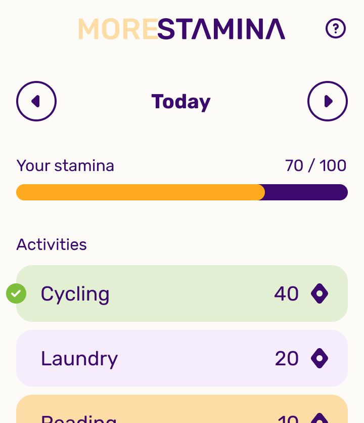 More Stamina es una herramienta de organización de tareas y manejo de la energía diseñada para personas con EM, que intenta minimizar el impacto que tiene la fatiga en la vida cotidiana.